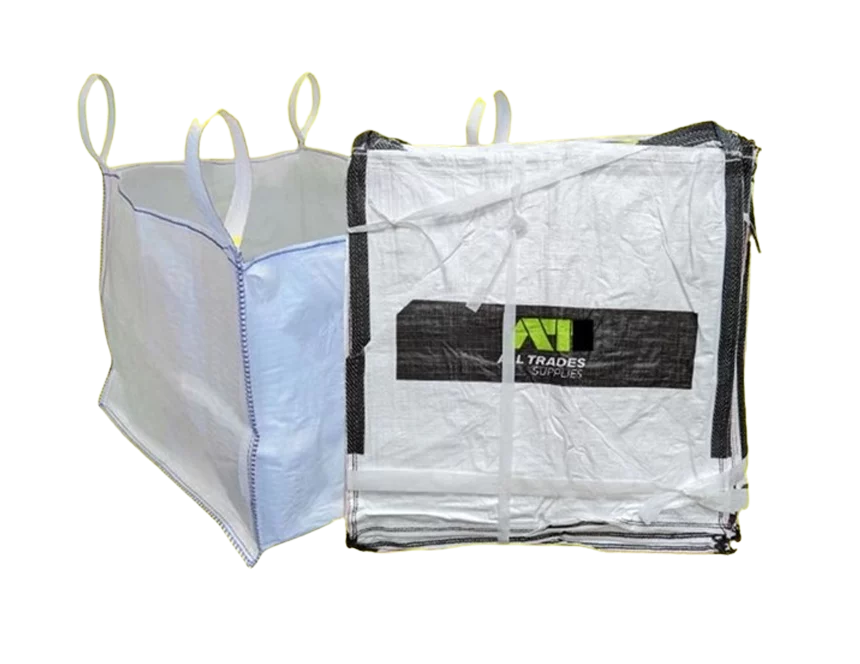 Clearance one tonne builders bags in 90 cm × 90 cm × 90 cm size, printed in green and black on two sides as illustrated. These FIBC bulk bags are our usual high quality and are rated for a 1 tonne load. Offered from a cancelled order at 10% to 20% below our normal price. You can purchase 100 bags at the unit price normally applied to 500, and offers are invited for quantities of 500 or more.
